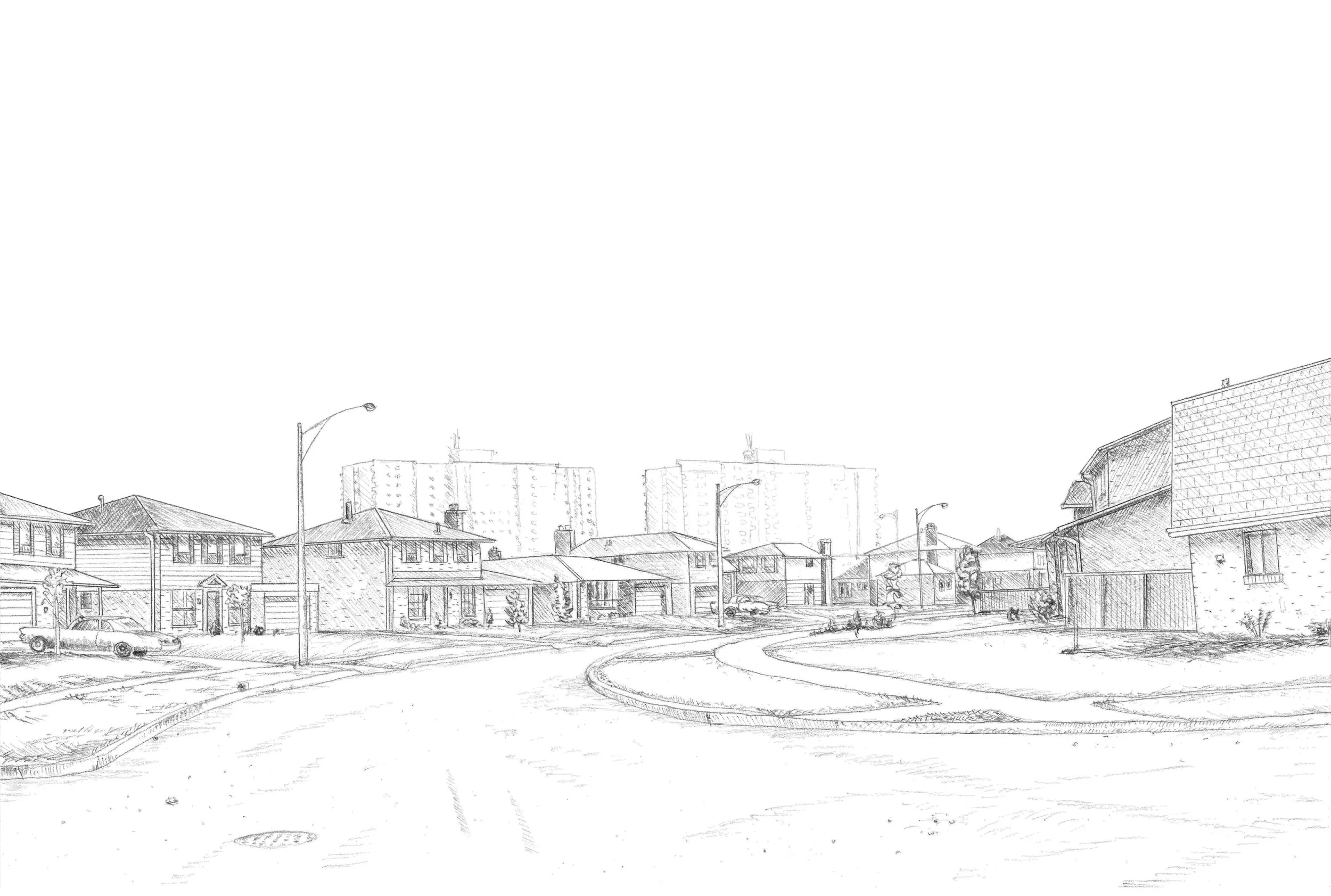 A series of designs and hand drawn animations for an urban design exhibition, reimagining the future of Toronto’s suburban neighborhoods to house millions of new residents, 2020-2021, curated by Michael Piper and Richard Sommer.
